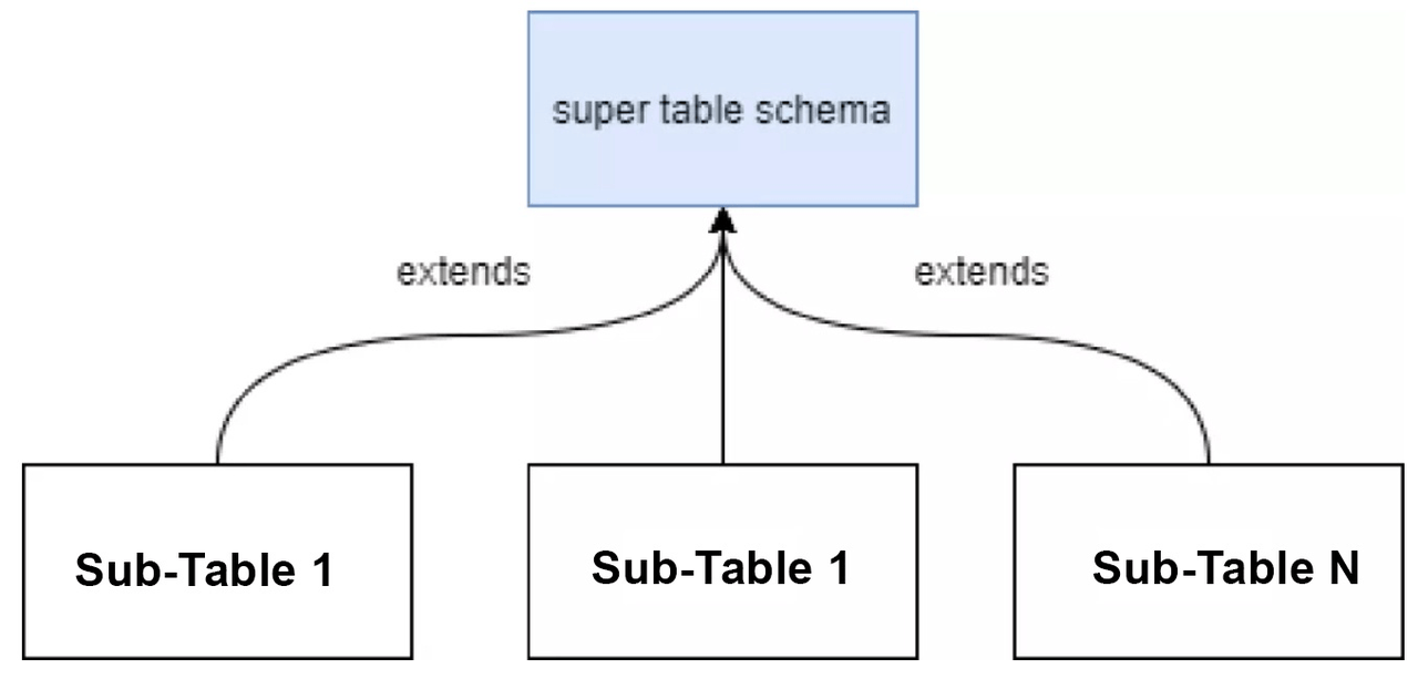 TDengine has the concept of a supertable. For example, in the Cross Express group case, all vehicles have their own subtable which inherit from a parent table called a supertable. The supertable defines the structure specification of the subtable but does not store the actual physical data. However we can perform statistical analysis and query data across subtables by querying the supertable, instead of needing to query each subtable.