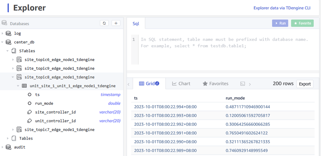 Then click Explorer in the main menu. The supertables from the edge node have been replicated to the central node, and the same data is contained within them.