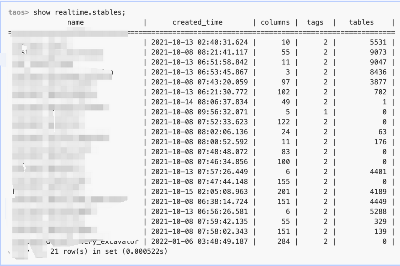 As can be seen from the above figure, the number of collection parameters i.e. the number of columns for each type of equipment is relatively large and often in the hundreds. This indirectly affects the compression rate which we discovered later while investigating other issues with TDengine staff.