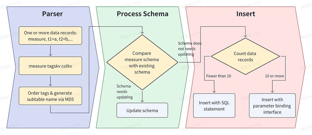 In the current process, each record is iterated over, extracting the measurement (measure), tags, and columns (col) key-value pairs. These are stored in custom structures, and the system sorts the tag keys and generates corresponding sub-table names based on predefined rules. However, the repeated parsing, sorting of tags, and subtable name generation in this workflow add unnecessary time and computational complexity.