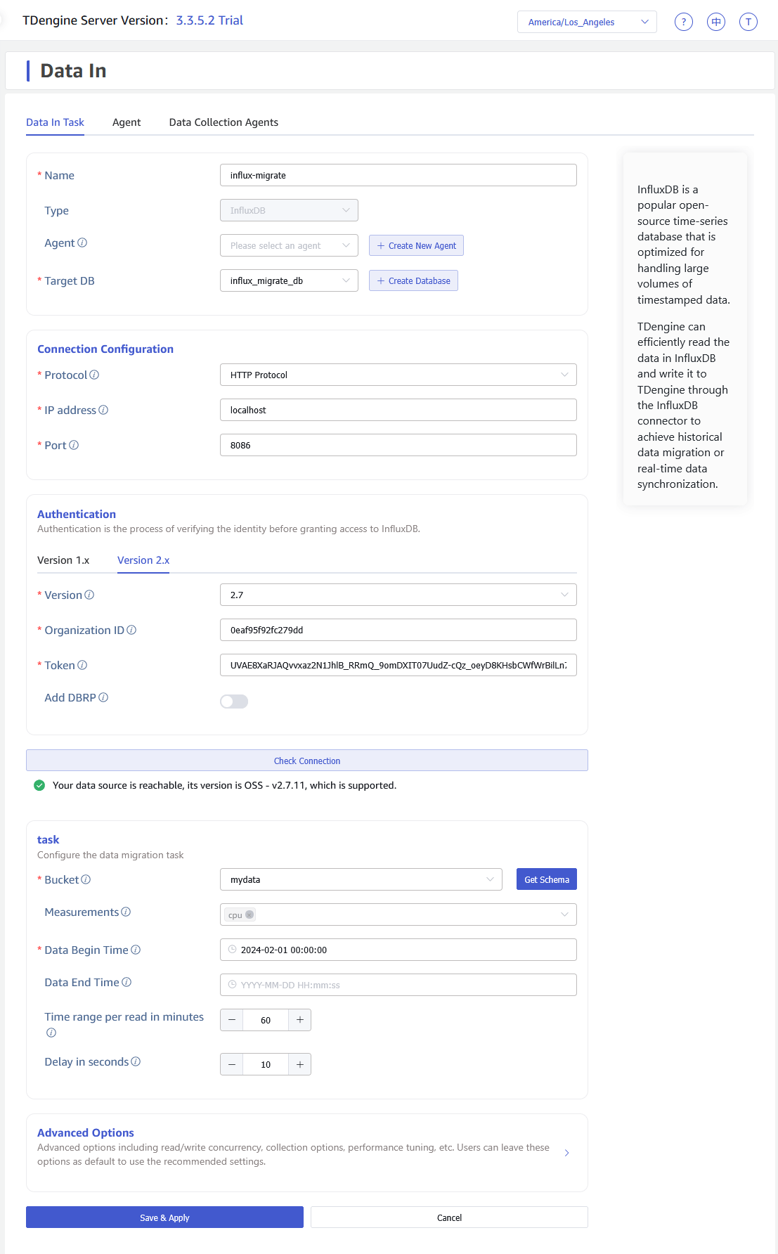 Once you click Save & Apply, the data replication task is started, and data is replicated into your TDengine deployment. Let it run for a few days and compare the results to make sure the data is identical — you can check row counts, for example. When you’re satisfied that the data is in sync, you can simply redirect your data sources to write data to TDengine instead of InfluxDB.