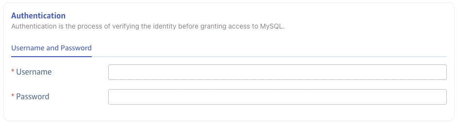 Under Authentication Information, enter the username and password with which you want to connect to MySQL. The user you specify must have read permissions in the organization.