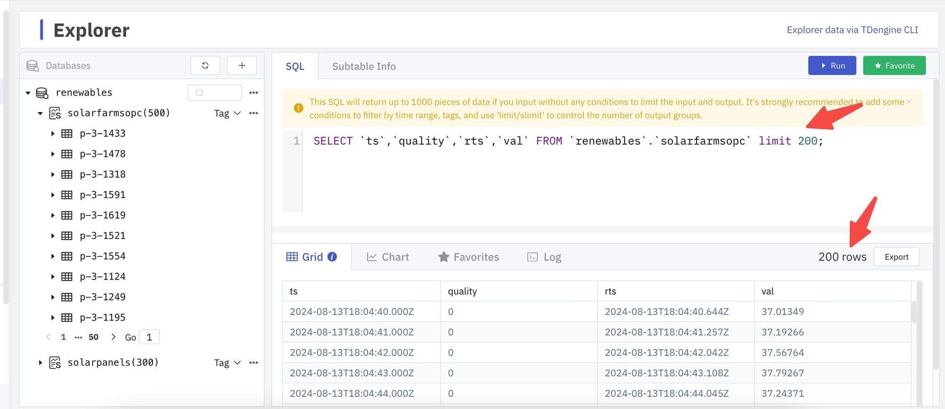 We can now click on the “Explorer” icon to see the database and whether it is ingesting data from the OPC-UA data source.