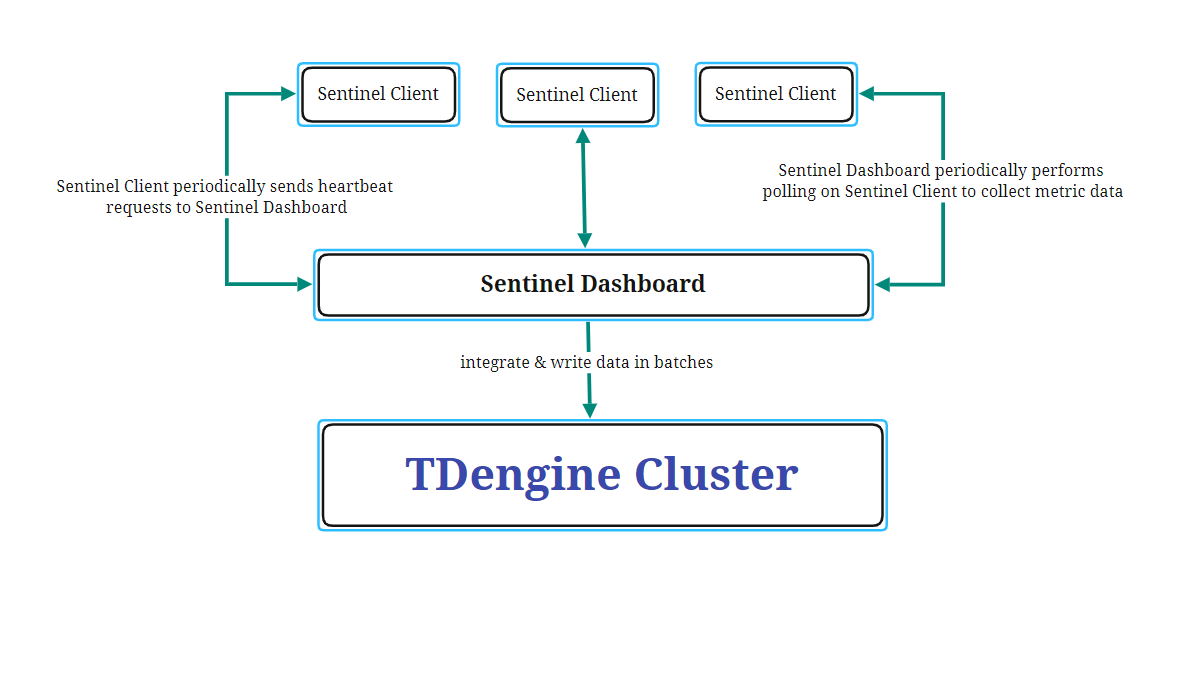 In light of the data processing pipeline shown above, all business systems that have connected to Sentinel will periodically send heartbeat requests to Sentinel Dashboard for ensuring the smooth and stable running status of the machine. Meanwhile, the dashboard will perform polling on all machines and pull & integrate metrics into the TDengine cluster through batch writing.