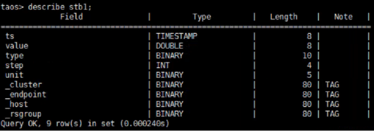 In light of the data model recommended by TDengine, a STable should be created for each type of data point. Take “cpu_usage” for example, the metrics of “cpu_usage” can be collected from every host machine (a data point), then we can create a STable to store those metrics. According to the characteristics of monitoring data and the usage scenarios, the data model can be designed in the way as shown below: