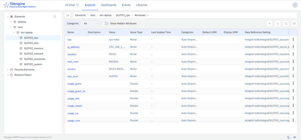 - Effortless data ingestion – TDengine IDMP is seamlessly integrated with TDengine TSDB. Once monitoring data is written into TSDB, it can be quickly imported into IDMP and displayed in a tree structure, giving you a clear view of all monitored physical and virtual machines at a glance.