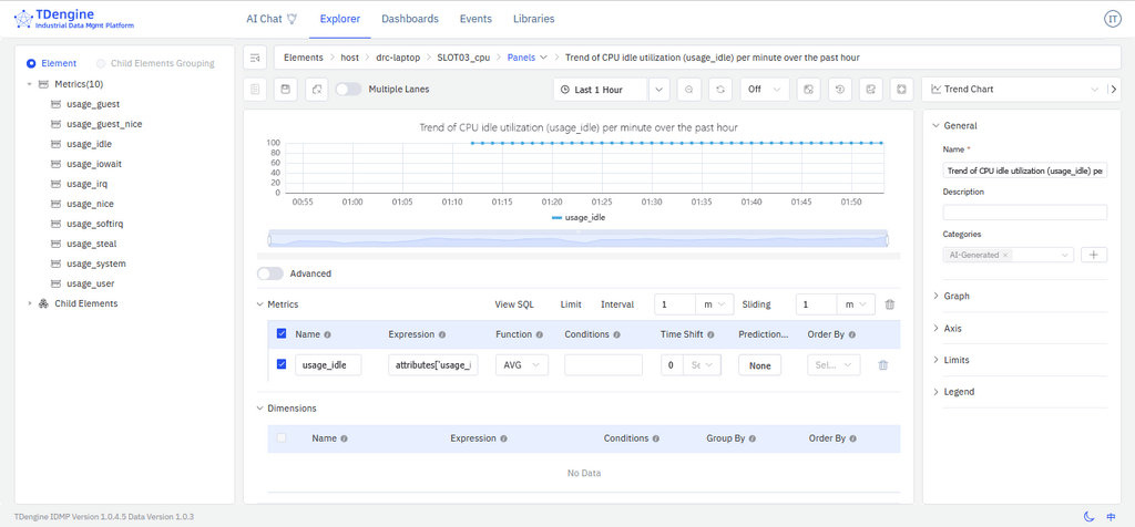 path → IDC01 → RACK02 → SLOT03_cputo go to its panels page. - Wait for the AI to generate panel recommendations. Choose one based on your needs—for example: Trend of CPU idle utilization (usage_idle) per minute over the past hour, displayed as a line chart.