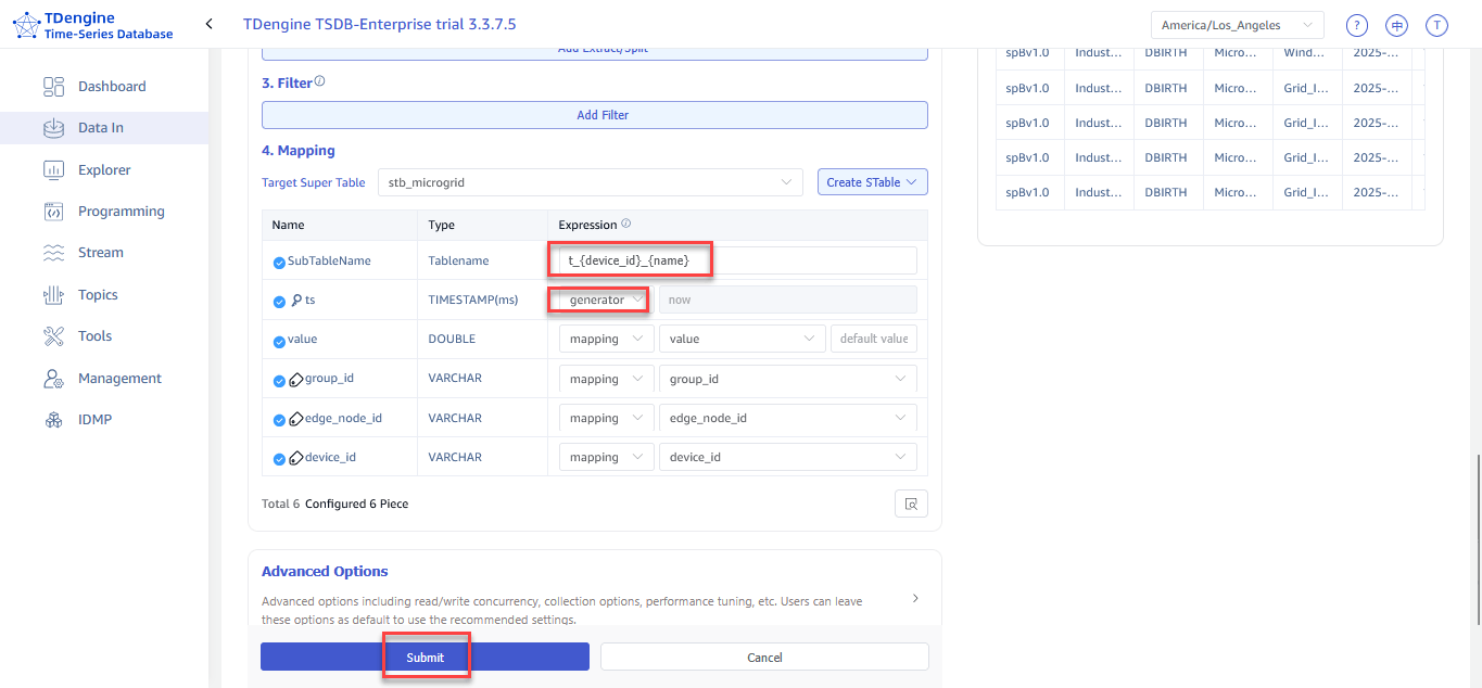 t_{device_id}_{name}. This specifies that subtables are named using the device ID.Then in the ts field, select generator.