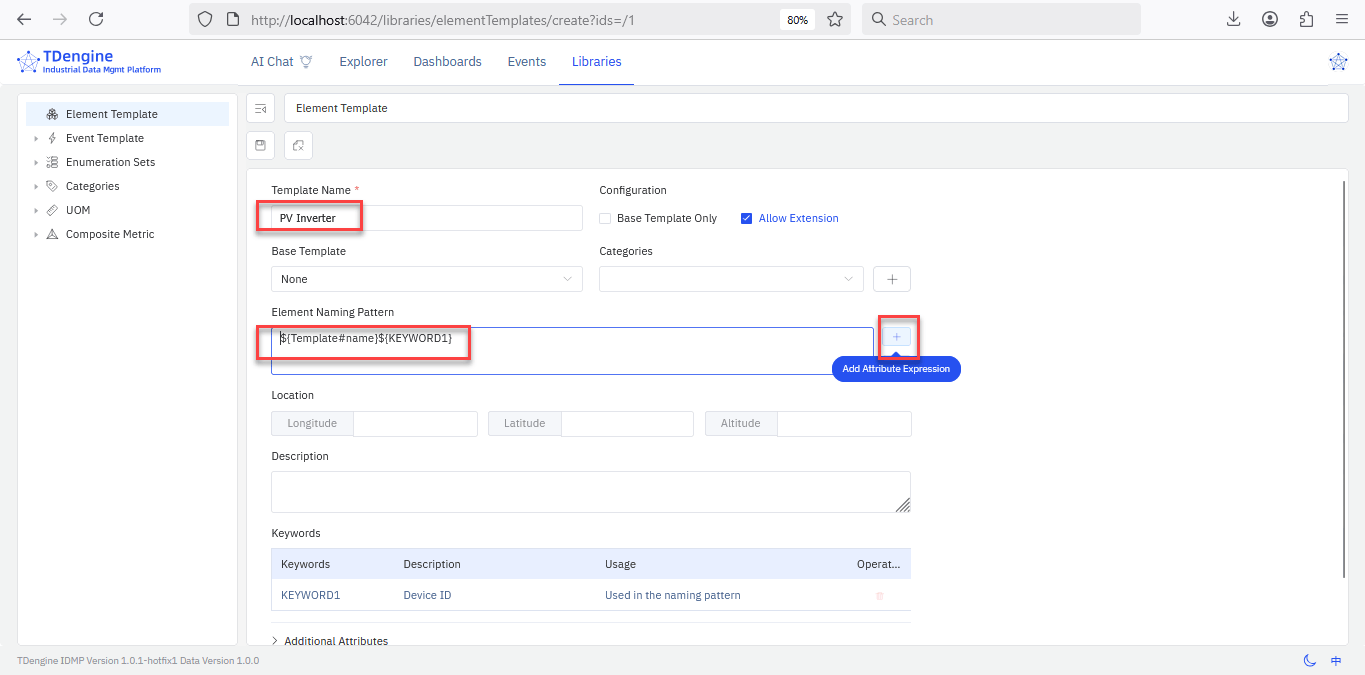 PV Inverter. - Element Naming Pattern: Click the Add Attribute Expression (+) button and select Template Name. Click the button again and select KEYWORD +. In the dialog box displayed, enter