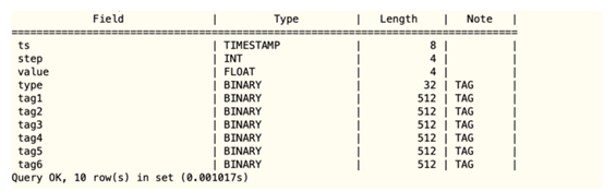 For TDengine, it is optimal to define the table schema so as to get the maximum possible performance. From the requirements above, one might be tempted to flatten the structure and create a large number of parameters at one time but this will degrade performance. After communicating with TDengine technical support staff, we were given two schema options: