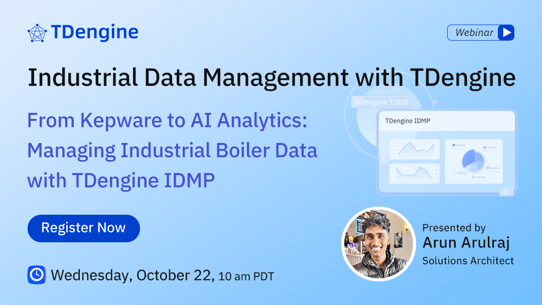 Discover how to turn industrial boiler metrics into intelligent dashboards in minutes. On Wednesday, October 22, we’ll walk through a demo showing how to collect boiler data using KEPServerEX, ingest it into TDengine TSDB, and build an asset model in TDengine IDMP. You’ll see how AI can generate dashboards, real-time analytics, and alerts automatically using natural-language queries and without needing to write SQL. Join us to see a full-stack solution for monitoring critical equipment at scale with speed and ease.